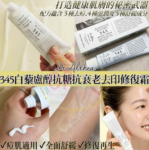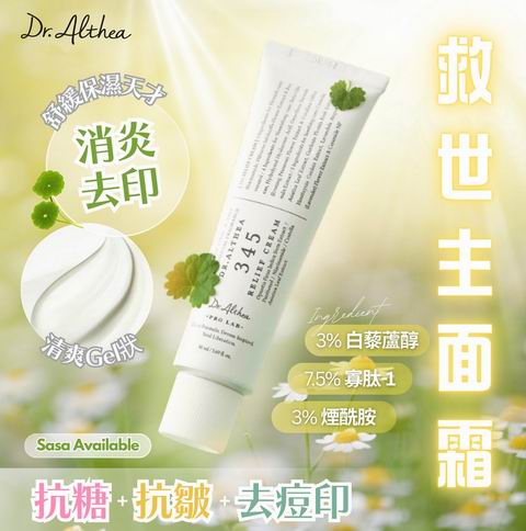 Dr.Althea 345白藜芦醇修复霜是一款集抗痘、抗糖、抗老于一体的多效面霜,其“345”配方体系涵盖3类淡印成分(烟酰胺/白藜芦醇/玫瑰茄)、4重保湿精华(神经酰胺/泛醇等)及5种舒缓植萃(积雪草/β-葡聚糖等);轻薄质地易吸收,能针对性改善痘印、泛红与粗糙,同时强化屏障并维持肌肤稳定,尤其适合油性及敏感肌日常修护。