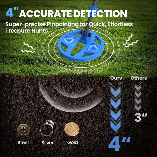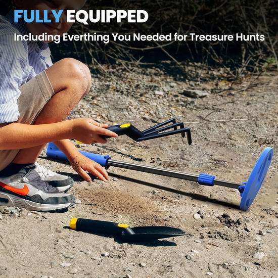 这款儿童金属探测器配备色彩鲜艳的液晶显示屏,让寻宝过程更加精彩有趣。海盗主题的动画图标将每一次发现都变成一次沉浸式的冒险,激发孩子探索户外的兴趣。配备6.7英寸防水探测线圈和内置LED灯条,探测到金属时会闪烁,为孩子们提供视觉和听觉上的双重提示。配备可调节长度的探测杆(22.4英寸-32.3英寸),适合3-12岁的儿童使用。套装包含轻便耐用的耙子和铲子。