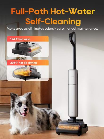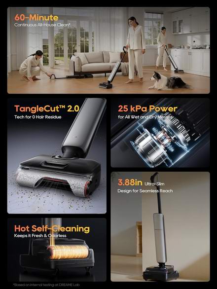 追觅 Aero Pro 旗舰级洗地机采用3.88英寸超薄美观设计,支持180°完全躺平,干湿清理所向披靡。搭载追觅首创的主动式防缠毛技术,通过前梳齿后刀刃的一体式创新结构,密集梳齿可精准捕捉缠发,能高效勾起毛发并完成切割,依靠25kPa的强大吸力,从根源上解决了毛发缠绕问题。在空间适配方面,Aero Pro采用行业首创的灵羽超轻薄系统,通过重新设计内部结构,最终实现躺平后高度仅9.85厘米,与市面上大部分扫地机厚度相当,可轻松进入沙发底、床底、柜底等以往难以触及的低矮空间,实现全屋无死角清洁。静音模式下可连续清洁长达60分钟,1000毫升大容量水箱可最大限度地减少加水次数。此外,Aero Pro支持全程高温自清洁功能,采用90℃的热水彻底清洁滚筒和管道,然后95℃热风仅需5分钟即可将其完全烘干,防止异味产生,并保持清洁如新。