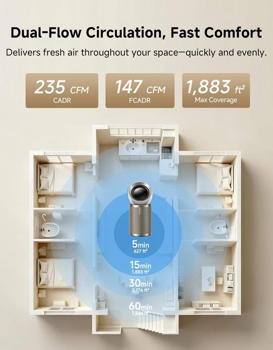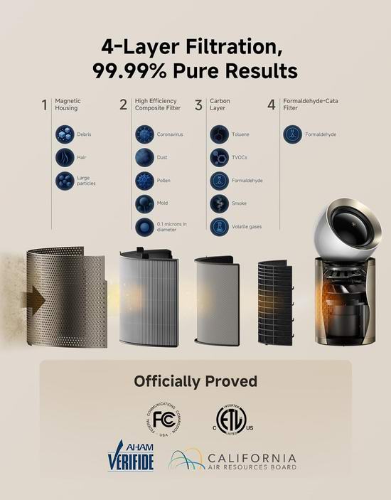 四层过滤,过滤甲醛、过敏原、悬浮微粒,UVC紫外灯+等离子双重除菌,高效除病菌。采用追觅双风道技术将空气净化效率提升33%,向上和向前的出风口可提供253 CFM的洁净空气,快速均匀地覆盖高达1883平方英尺的区域。AI感测追踪技术,侦测人开机,风随人转动。内置雷达可立即探测移动物体,并在32.8英尺范围内自动调节气流方向,覆盖范围达180°,甚至可以在多人之间调节气流。99.99%洁净空气,可捕捉小至0.1μm的颗粒,并清除99.99%的灰尘、宠物皮屑、花粉、烟雾等,针对多达14种室内污染物,带来更健康的空气。