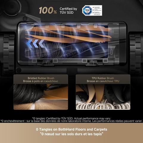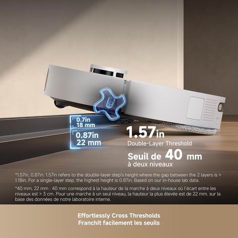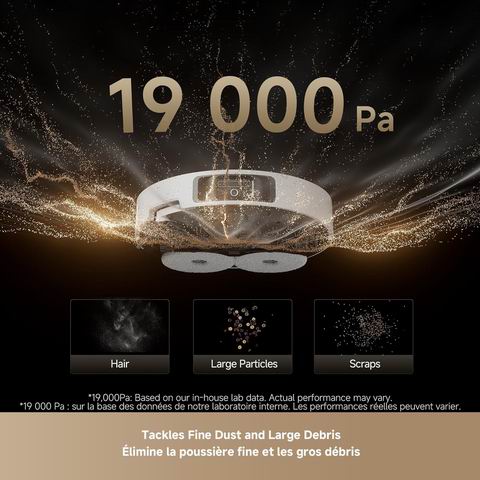 DREAME L40s 超级扫拖一体机器人搭载 19,000Pa Vormax 超强吸力第六代 TurboForce 电机静音高效吸除地板缝隙及地毯碎屑;HyperStream 双刷头(硬质橡胶刷+TPU 橡胶刷)有效防止毛发缠绕。支持通过 App 为不同地毯定制清洁模式,可伸缩拖布与边刷配合 EasyLeap 系统可越过 4 厘米障碍。一体化 PowerDock 智能充电座实现自动清空尘盒(最长 100 天)75°C 热水自清洁拖布并烘干、自动补充清洁液与清水,全程免手动维护。