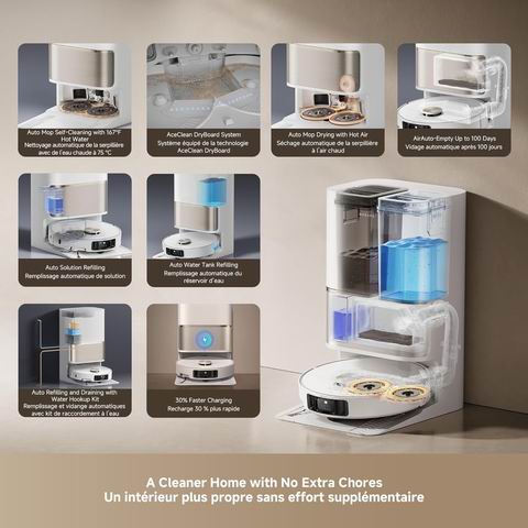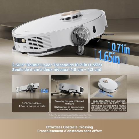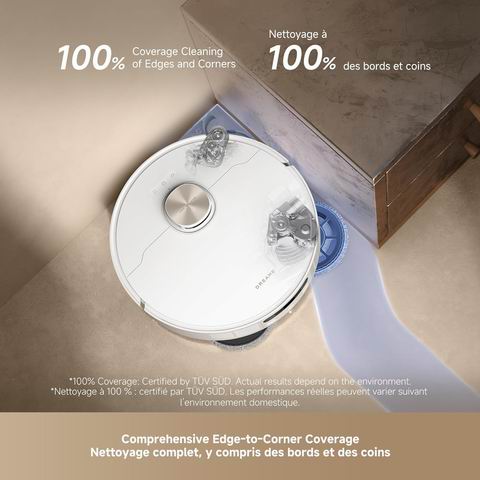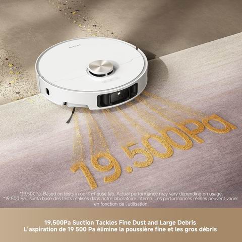 DREAME L50 Ultra 扫拖一体机器人集自动清空集尘盒拖地自清洁精准避障于一身,搭载第六代 TurboForce 高速电机带来 19,500Pa 超强吸力,安静高效吸除细尘与大颗粒;ProLeap 伸缩支腿可抬升至 6cm,轻松跨越门槛台阶;AI + 3D 结构光支持识别并绕开 180+ 类障碍物,减少碰撞;HyperStream 双刷头针对毛发防缠绕,兼顾硬地与地毯清洁;双柔性臂配合可伸缩边刷与拖布,加强边角与低矮、狭窄区域的深度清洁。