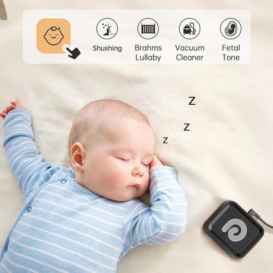 此款助眠器小巧便携,内置3种白噪声,3种风扇声音,8种大自然噪音,7种婴儿最喜欢的摇篮曲和声音等,25级音量调节,有效淹没各种环境噪音,如他人打鼾、交通噪音、邻居噪音等,可以有效帮助快速入眠,支持30/60/90分钟定时关闭。