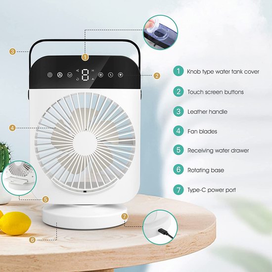 此款空调扇外形时尚,小巧便携。采用微米级蒸发雾化冷却技术,快速降低空气温度,让您可以在一个舒缓和平静的环境工作或睡眠,具有风扇、空调扇、加湿功能,4挡风速,支持70°摆动吹风,支持1/2/4/8 小时定时关闭,300毫升容量水箱,可加入冰块,进一步提升制冷效果,也可以加入水性精油或香水(不可加入油性精油),USB电源供电,配备LED液晶屏。
