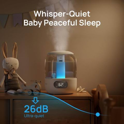 采用超声波雾化技术(2.4MHz),释放约5μm细腻水雾,帮助维持更舒适、也更适合室内植物的湿度环境;运行噪音低至约26dB,并配有可调氛围夜灯,婴儿房夜间使用更友好。顶部注水设计,加水无需翻转水箱,不易洒漏;大开口结构便于深入清洁,连水箱角落也更好打理。睡眠模式下续航可达约30小时,可覆盖最高约300平方英尺空间,适合卧室、家庭与办公室持续补湿。。另具备低水位LED提醒与缺水自动关机等安全功能,机身采用不含BPA的婴儿级材质,宝宝、宠物与全家使用更安心。