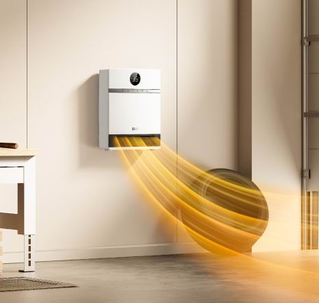 采用PTC陶瓷加热技术,能提供强劲暖风(风速达11.5英尺/秒)且运行安静(仅28分贝);它支持30°手动摆动、遥控器/手机App/Alexa语音多重控制,并具备精准ECO温控模式以实现节能。产品安全性高,拥有IP24防溅水等级和过热保护,专为壁挂设计(安装简便,电源线长约1.8米),非常适合卧室、办公室等室内空间(约18平米)使用。