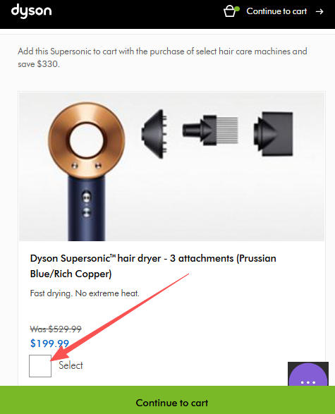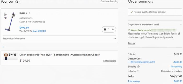 Dyson网店销售,原价:799.99加元+529.99加元,使用官方通过email发送的折扣码,总价降为699.98加元包邮。点击进入订购页面。