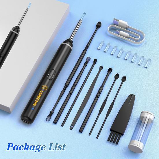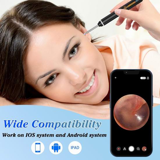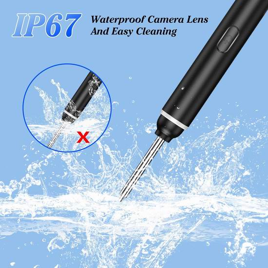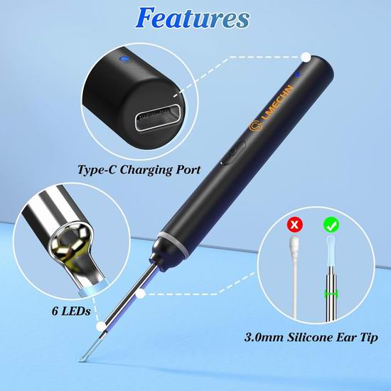 这款可视耳勺配备1920P高清镜头和锐化摄像头传感器,方便进入耳道,拍摄清晰的照片和视频。3.0mm 的直径符合人耳结构,安全配件可保护您的耳道。采用360°广角透明光学折射设计,配备6颗可调节LED灯,即使在昏暗的环境下也能提供清晰明亮的图像。IP67防水设计,可用水或酒精擦拭,清洁卫生。不仅可以用来清除耳垢,还可以用来检查牙齿、鼻腔、咽喉等任何部位。最佳焦距为1.5-2厘米。仅需30分钟即可充满电,实现超长待机。内置智能温控芯片,有效控制镜头温度,避免烫伤耳朵。附送金属掏耳勺套装。