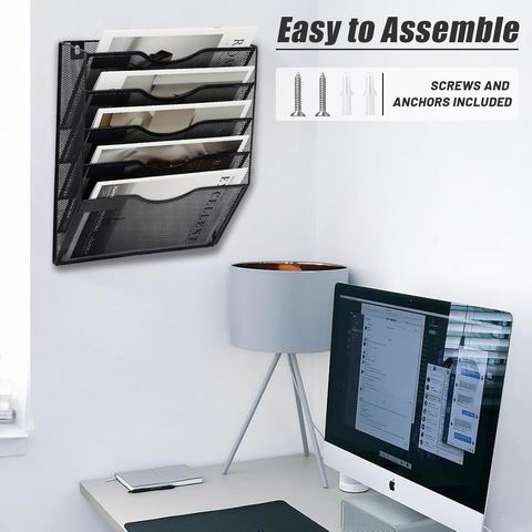 采用坚固金属网状结构与粉末涂层表面处理,充分利用墙面垂直空间,帮助保持桌面整洁有序。配备五层信纸尺寸收纳口袋(内尺寸约 12.6 × 7 英寸),可分类存放文件、图表、产品目录和宣传册,并附带姓名标签便于标识。弧形开口设计方便快速取放文件,安装简单,附带螺丝固定于墙面。整体尺寸约 14.9 × 12.8 × 3.9 英寸,适用于办公室与家庭环境。