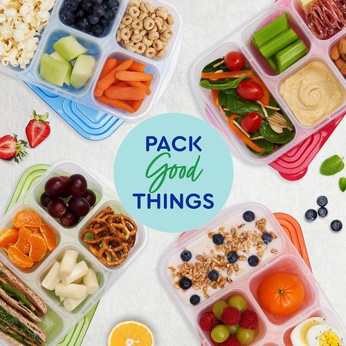 EasyLunchboxes  原创5隔间食品容器采用专利设计,均衡膳食,满足从儿童到成人的任何胃口需求;不含 BPA,易于打开的盖子,可堆叠、便携、可重复使用,可用于微波炉、冰箱和洗碗机 。