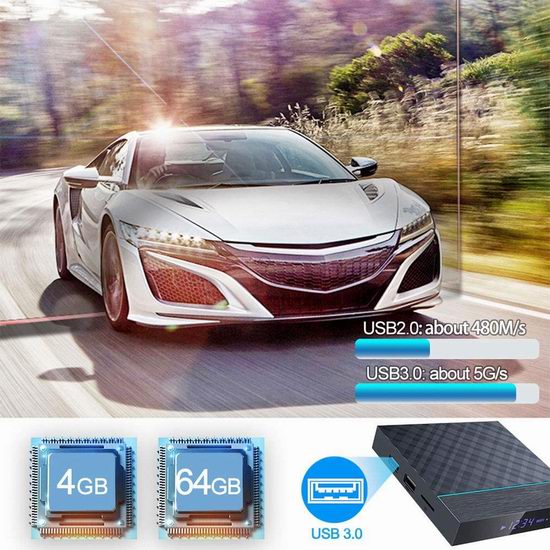 采用Cortex A55 Amlogic S905X3四核处理器,4GB内存,64GB EMMC空间,搭载Android 9.0操作系统,支持蓝牙4.0、双频WiFi,LAN以太网,支持H.265硬件解码,支持8K超高清视频源,最大支持128GB SD卡容量扩展,2高速USB接口,支持U盘及最高4TB移动硬盘。