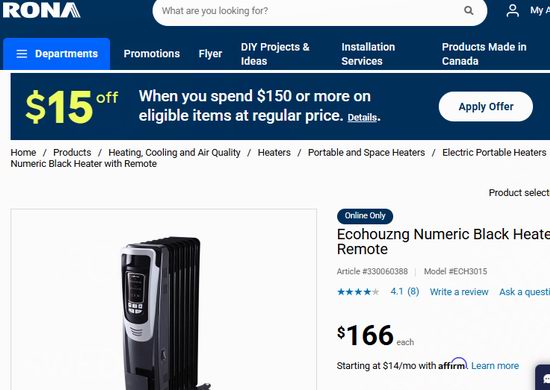 Ecohouzng ECH3015 数控式电热油汀4.5折 77加元包邮!