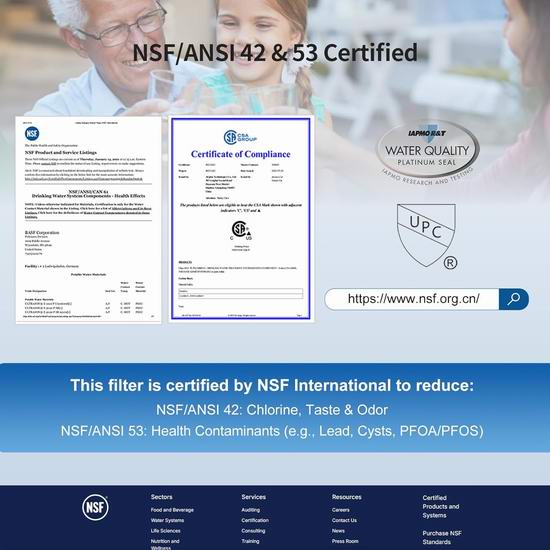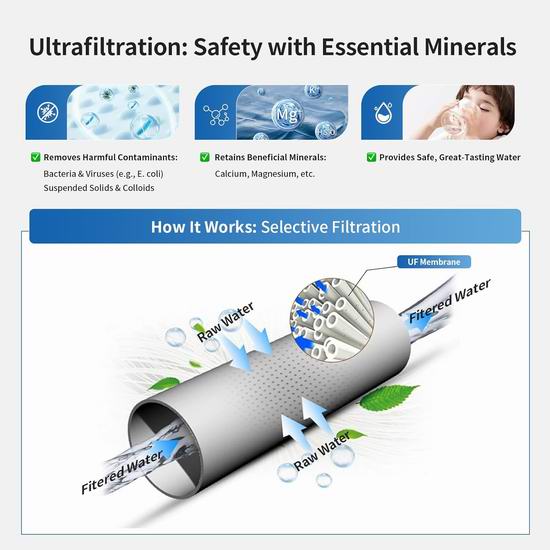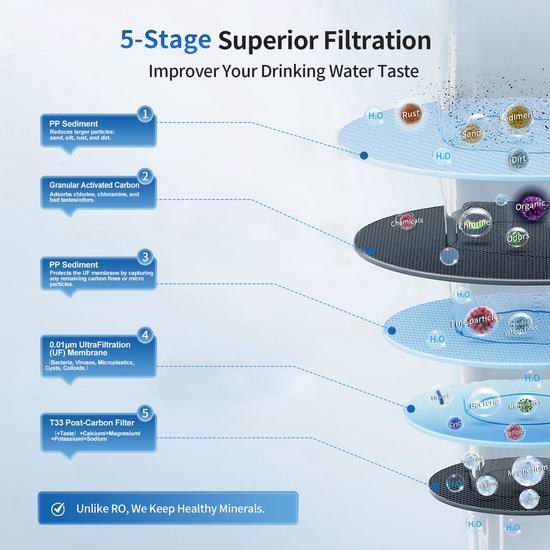 这款超滤净水系统采用美国0.01微米超滤技术和五级先进过滤工艺,包含0.01微米超滤膜等4种不同滤芯,可有效去除99.99%氯、异味、重金属、铁锈、沉淀物、沙粒及其他颗粒物,同时还能保留钙、镁、钾等有益矿物质,带来自然清爽的口感。不会降低TDS(总溶解固体)含量,因为有益矿物质会保留在水中。经第三方实验室测试,可提供洁净清爽的饮用水,适用于冲泡咖啡、茶或婴儿配方奶粉。净水器采用304食品级不锈钢制成,确保其坚固耐用、耐腐蚀且性能持久。所有与水接触的部件均符合NSF/ANSI 61标准,并且完全不含铅和BPA,可提供安全可靠的饮用水。