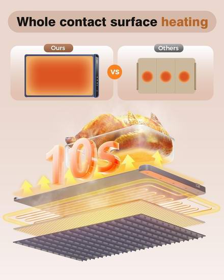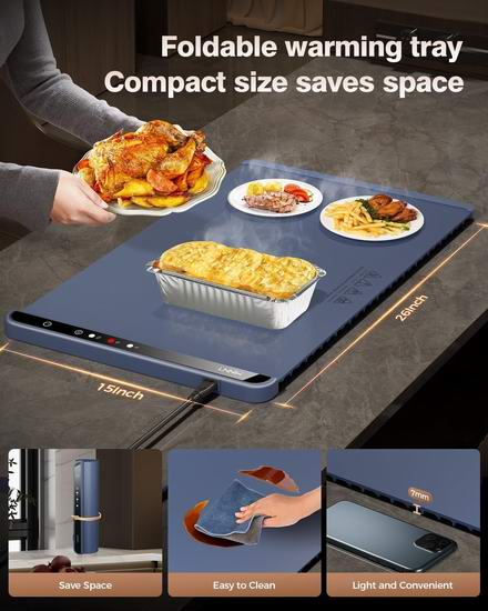 这款食物保温垫具有自动定时器,支持3档温度条件,可满足保温饭菜、解冻牛排、发酵面团等各种需求。兼容玻璃、不锈钢、陶瓷等所有类型的厨具和餐具。采用可折叠、可卷起的结构,方便收纳和携带。尺寸为26x15英寸。