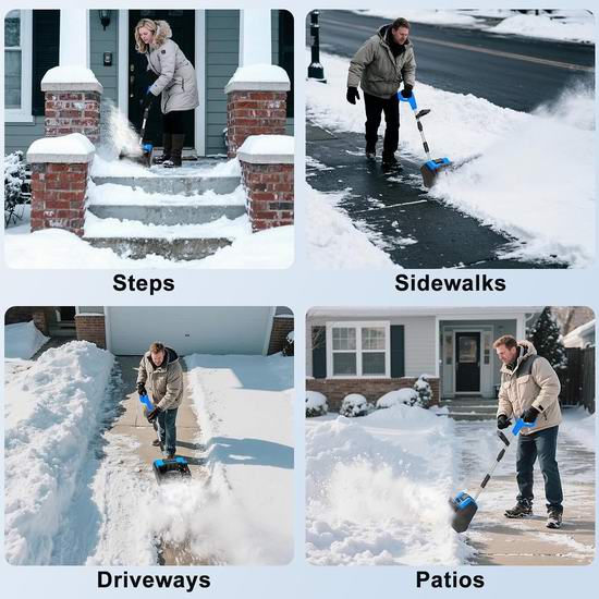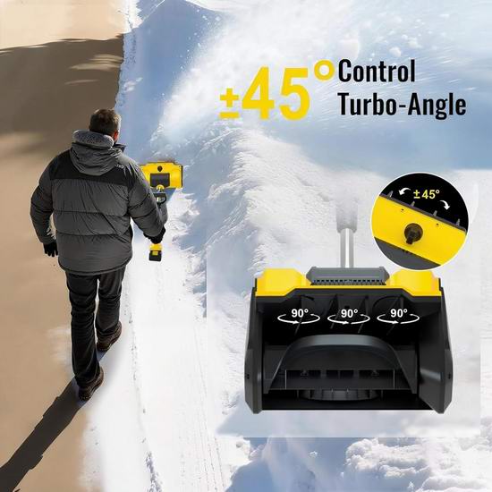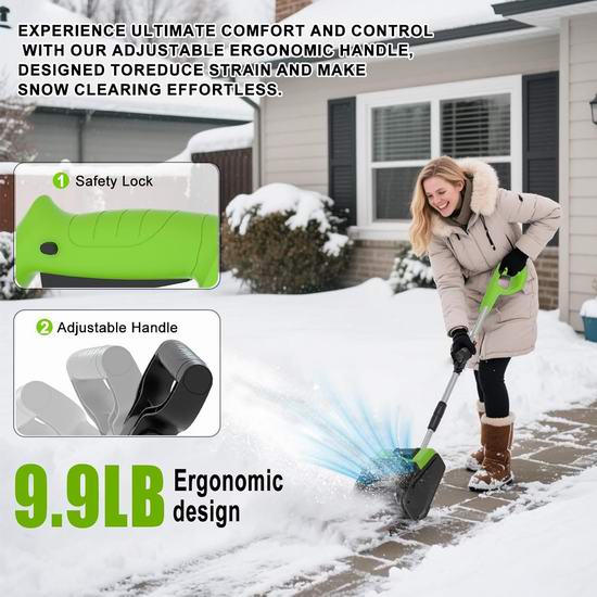 这款电动铲雪机一次即可铲除深达6.3英寸、宽达12.5英寸的积雪,抛雪距离可达27英尺,出雪槽角度左右可调±45°,实现精准抛雪。配备两块21V 4.0Ah锂电池,续航时间长达15-25分钟。可在-15℃至10℃的低温环境下正常工作,即使在严寒的冬季也能保持性能稳定。电池采用多重保护设计,配备抗低温锂离子电芯,一次充电即可清理多达6条车道。符合人体工学设计,重量仅9.9磅,配有舒适的握把,易于操控,即使是老年人也能轻松推动和操作。