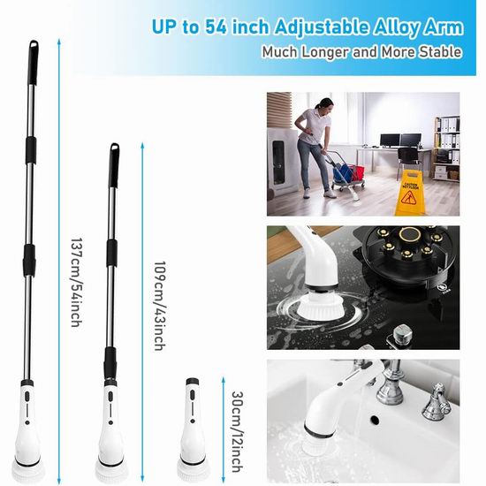 无绳设计,拥有25瓦强劲动力,电动不弯腰,省力又省时,120分钟持久续航,显示剩余电量,无线畅行刷遍整屋,两档转速(400-450转/分钟),可调节长度,长短两用,长柄43-54英寸,短柄12英寸,7种刷头随意切换,无线约束,静音运行,IPX5防水,厨房浴室汽车都可以用,一机解决所有需求!