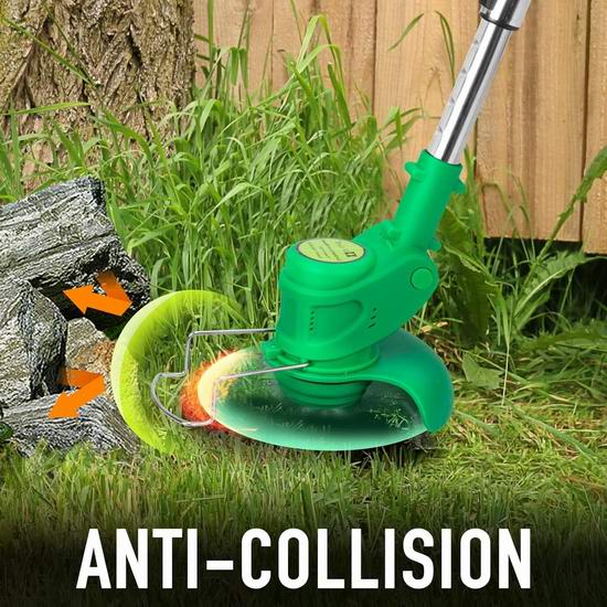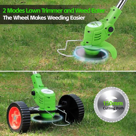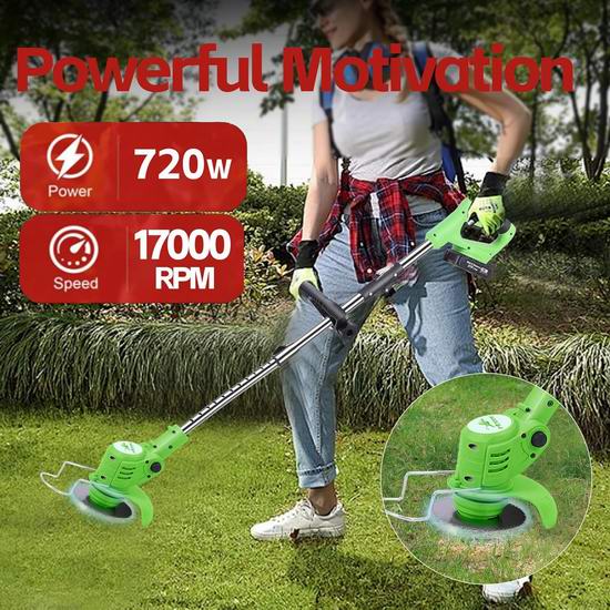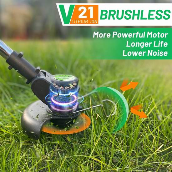 此款割草机采用创新设计,割草、修边、修剪三合一,无绳设计,方便使用,空载转速高达17000RPM,配备21伏 3AH锂电池,续航40分钟。配备塑料刀片用于修剪软草,金属刀片用于修剪草坪、杂草和小灌木,锰钢圆锯片适合修剪较粗的灌木树枝。套上割草机配件,就是一台割草机。轻型设计,长度可在35-47英寸之间调节,重量轻巧,女士操作也毫不费力。