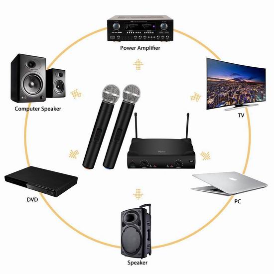 采用双通道VHF无线电,使用200-280MHz频段,避免干扰频率,有效使用距离可高达130英尺,高信噪比,失真率低,包含2个无线麦克风和1个接收器,适用于家庭派对卡拉OK、舞台表演或会议讲座。