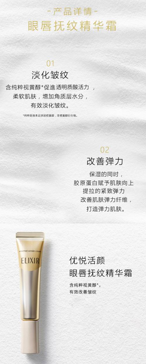 怡丽丝尔家的“断货王”眼霜,经测试能够有效淡化皱纹,弹润保湿。眼霜中纯粹视黄醇的成分,作为抗衰老护肤原料中的超级明星,能够促进生成透明质酸,提升肌肤水分含量,改善皱纹,让 肌肤平滑紧致,触感轻薄易吸收。同时配合胶原蛋白GL成分、高保湿透明质酸成分,改善肌肤纹理,给予并维持肌肤弹性。这款眼霜能够有效修复熬夜带给眼周的伤害,摆脱熊猫眼,重焕睛采,恢复活力!