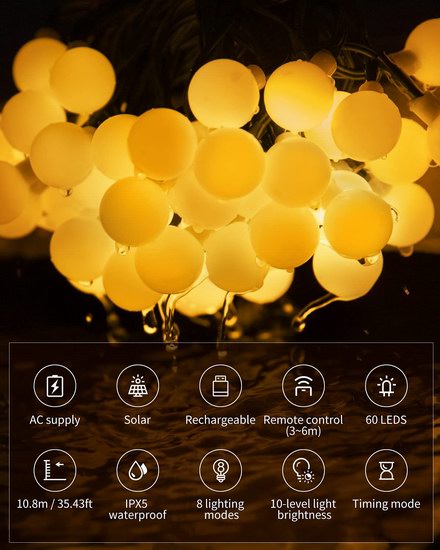 采用太阳能供电,无需接线,易于安装,在室内使用时可使用USB电源供电,共有60颗明亮的LED灯泡,具有8个照明模式,10级亮度,增加趣味性,灯串长度35.5英尺,IPX5防水,适用于室内、室外、庭院、树木、房屋等的装饰,充满电后可续航8小时。