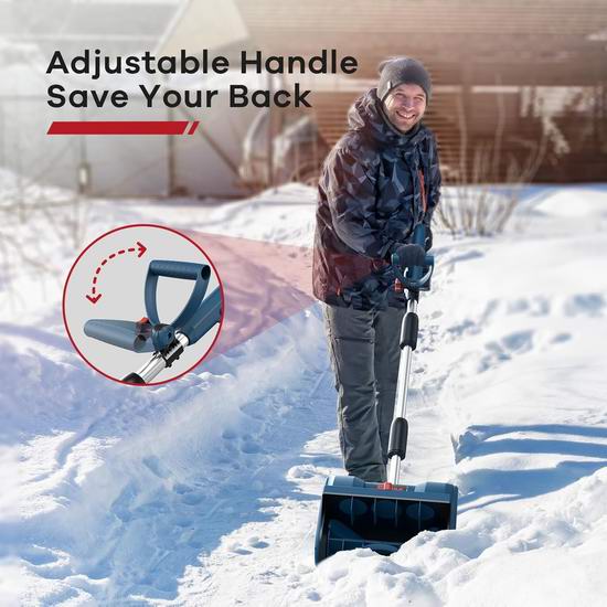 这款无绳铲雪机配备强劲的20伏电机和可充电的4.0安时锂电池组,续航时间长达20-25分钟。铲雪宽度12英寸、深度6英寸。符合人体工学的把手,可根据使用习惯调节角度,不会造成背部疲劳。挡雪板可旋转±30度,方便抛雪。防滑把手配备双重安全开关,降低意外启动的风险。
