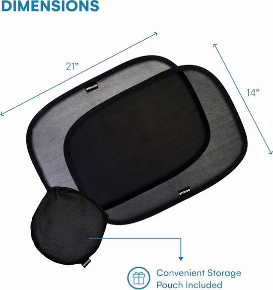 这款车窗遮阳罩可提供97%的紫外线和眩光防护,双层设计,一面是网状面料,视野开阔,另一面是静电吸附,方便固定。适用于大多数车型,安装简便,只需将其放在车窗上,然后用手抚平即可。尺寸为21 x 14英寸。