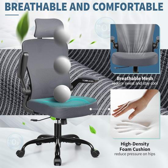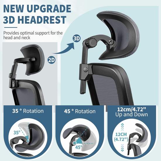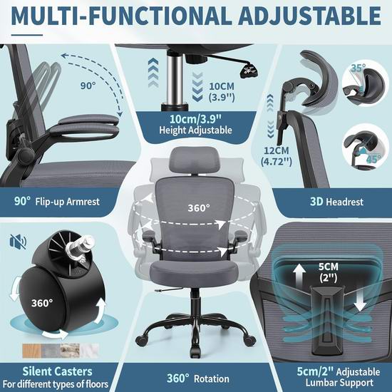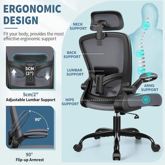 符合人体工学设计,Y型靠背支撑,贴合脊椎自然曲线,充分支撑背部,帮助释放脊椎和肩部压力,靠背可在90-120度调节。网眼靠背,通风透气,柔软的高密度天然海绵坐垫,符合人体臀部曲线,升降头枕,扶手可上下翻转90度。