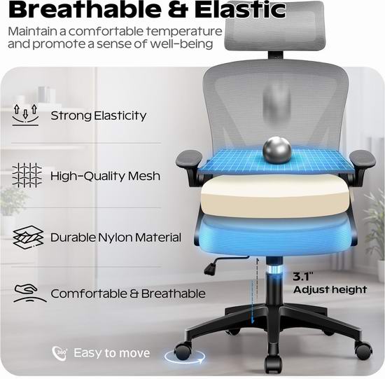 每天久坐8小时,腰酸背痛、肩颈僵硬?拥有一把好的人体工学椅,能让你从“硬扛”变成“享受”!这款高靠背办公椅可以完美贴合人体S型脊柱曲线,为身体提供充足的支撑点,有效缓解疲劳,即使工作一整天也能保持健康的脊柱姿势。头枕角度和高度均可自由调节,为头部和颈部提供更多支撑,有效缓解长时间工作引起的肩颈疼痛。灵活的扶手可以向上翻转,方便您找到最舒适的手臂位置。高密度海绵填充的坐垫弹性好,不易变形,即使长时间久坐也能提供良好的支撑。