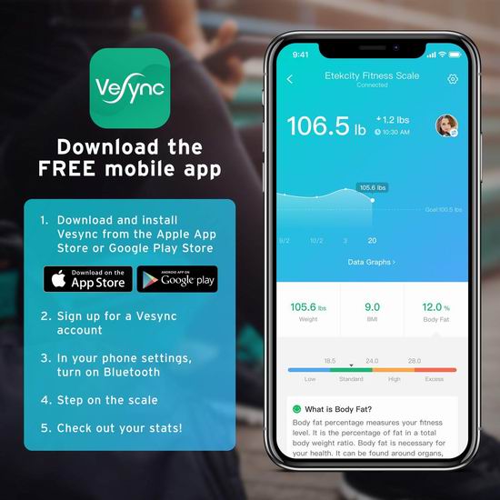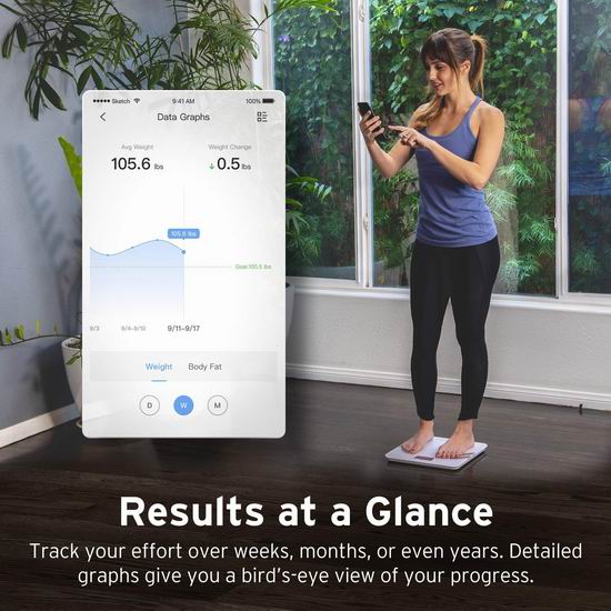 采用生物电阻抗分析和自动识别技术,准确测量体重、脂肪、体内水分、肌肉含量、BMI体重指数、BMR基础代谢率、骨量和内脏脂肪。具有蓝牙功能,通过App软件查看您的健康视图,兼容Apple Health,Google Fit和Fitbit等热门健身APP。6mm厚钢化玻璃台面,LED显示屏,最大承重400磅,自动关机,自动调零,低电和过载提示。3节AA电池供电(已包含)。