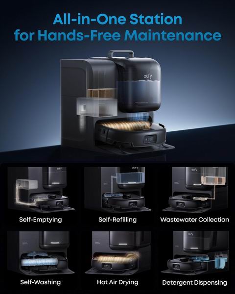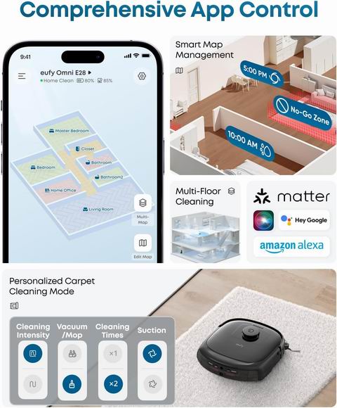 这款 eufy E28 便携式地毯深层清洁机器人 采用 HydroJet 滚轮拖布系统,每秒自动清洁拖布 6 次,确保整个清洁过程高效卫生。配备 FlexiOne 可拆卸便携式深层清洁器,可轻松处理地毯、楼梯及织物污渍。拥有 20,000 Pa 涡轮吸力,可深度吸除灰尘与毛发;双螺旋防缠绕刷头 减少毛发缠绕;CornerRover 臂 实现 100% 边角覆盖。内置 一体式清洁站,支持自动清空、清洗、补水、烘干和洗涤剂分配,简化维护。支持 2.4 GHz Wi-Fi 连接及应用程序固件更新,电压为 110V,是集吸尘、拖地于一体的高端智能清洁解决方案。