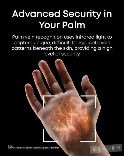 • 掌静脉精准识别:采用红外扫描皮下血管,0.1秒快速解锁,识别率高达99.99999%