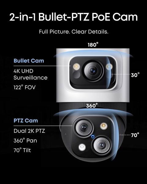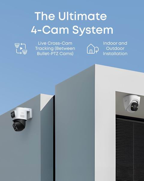 • 2 × 4K 半球摄像头(固定区域)+ 2 × 4K 枪式云台摄像头(超广角)+ 1 × 2K 360° 全景云台摄像头(8× 变焦主动跟踪),提供全景 + 特写双重监控。