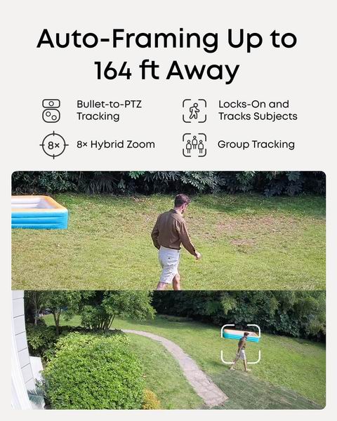 • 云台摄像机可自动锁定并跟随目标(最远 164 英尺 / 50 米),自动变焦让目标始终位于画面中心。