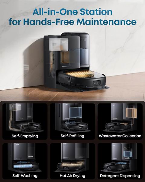 eufy E25 扫地机器人是一款集扫、吸、拖于一体的智能清洁设备,搭载 HydroJet 深度清洁系统,能每秒自动清洗滚轮拖把六次,保持拖布洁净。其 一体式清洁站 支持自动清空尘盒、清洗拖布、补水、烘干及添加洗涤剂,省时省力。拥有 20,000Pa 涡轮吸力,轻松吸除灰尘与毛发;双螺旋防缠绕刷头 有效防止毛发堵塞。搭配 CornerRover 边角臂 实现 100% 边缘覆盖,彻底清洁墙边与角落,是宠物家庭的高效清洁利器。