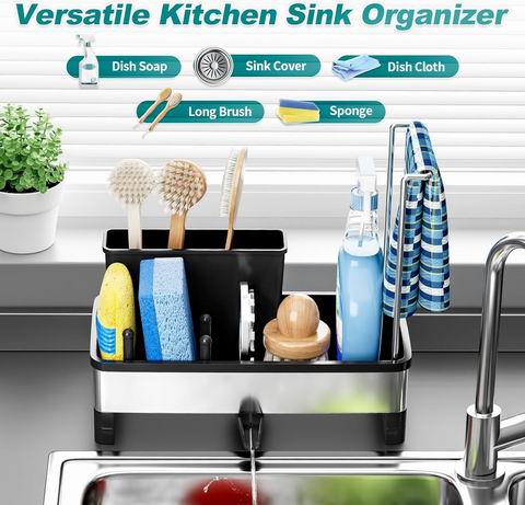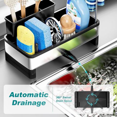 采用优质防锈不锈钢材质打造,坚固耐用,不易变形,表面耐指纹易清洁,底部配有防滑橡胶垫,有效保护台面。内置360°旋转排水嘴,可将积水直接引流至水槽,减少台面积水并促进工具快速干燥。配备可拆卸刷架与抹布架,便于收纳不同尺寸刷具及悬挂晾干抹布;合理分隔设计可分类摆放海绵、洗洁精、皂液器、水槽塞等用品,结构紧凑,适合空间有限的厨房,提升台面整洁度与使用效率。