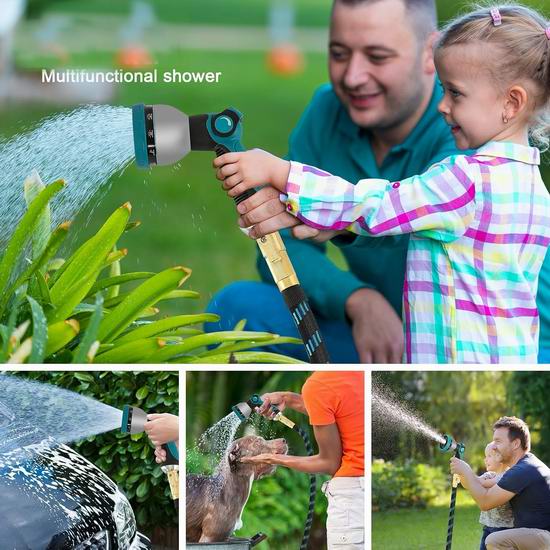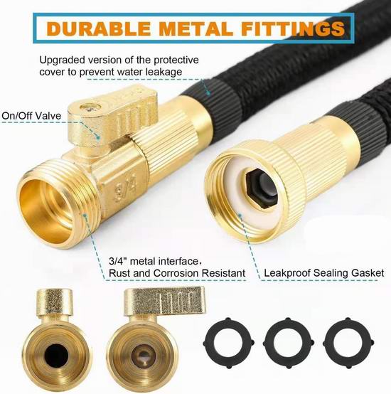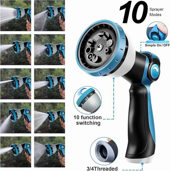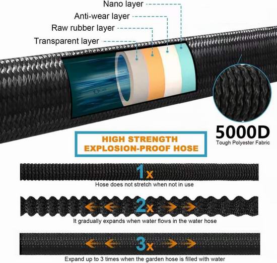 水管采用四层耐用乳胶和高密度5000D涤纶针织外层面料制成,具有极佳的伸缩性能,原长约10米,打开水龙头后可伸长3倍,最长可达100英尺(30米)。采用金属接头更加耐用,且不易腐蚀生锈。内管采用加厚乳胶制成,可承受3至12巴的高水压和41至113℉的温度。接3/4英寸接头与加拿大标准水龙头匹配,并配有开关。喷头具有10种喷水模式,适用于浇花、洗车、清洁房屋以及在院子里给宠物洗澡。附送1个收纳袋和1个水管挂架,方便悬挂和收纳。