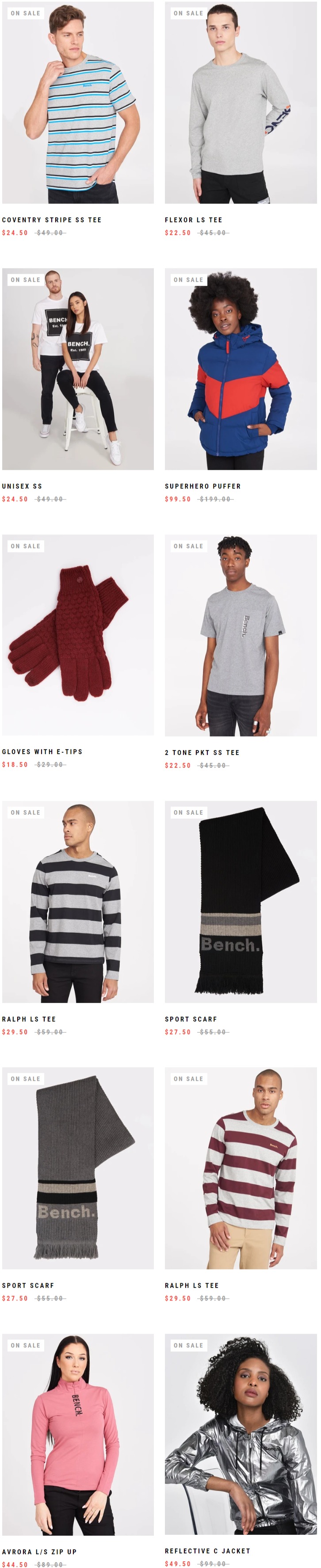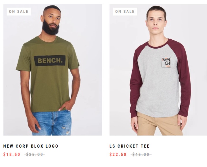 Bench网店销售,精选男女TEE、卫衣、夹克 5折起+额外7折,使用折扣码:CANADA30 ,满99加元包邮,点击进入订购页面。