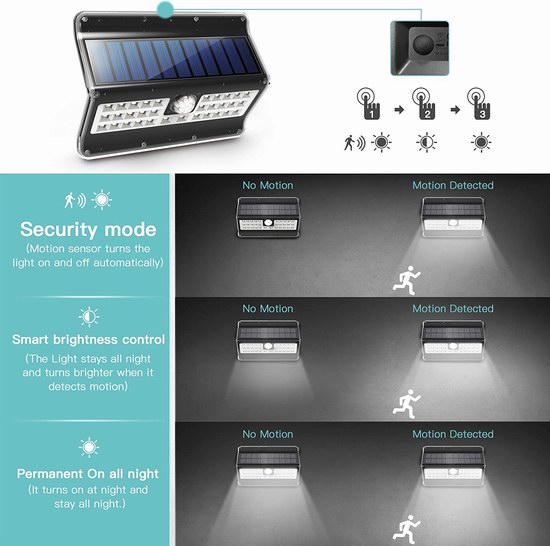 配备32 LED灯珠,优质PC灯罩具有玻璃般的透明度和高透光能力,提高了灯具的亮度,照明范围高达200平方英尺,探测角度120度,有效探测距离13英尺(4米),三种照明模式,30秒后自动熄灭,IP65防水设计,防水抗冻耐热,适用于各种天气状况。适合室外照明,可用于照亮车道、庭院、草坪、阳台、入口等。