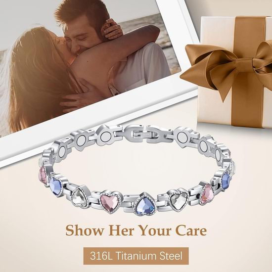 这款磁性手链采用优质钛钢材质,防过敏、防水、耐腐蚀,内置强大的钕磁铁,提供最大效力,助您每天保持最佳状态。手链设计可调节,配有免费拆卸工具,5分钟内即可轻松调整至完美贴合,长度为8.82英寸,重量仅29克,佩戴舒适便捷。手链上镶嵌闪亮的方晶锆石,轻盈且多用途,兼具美观和磁疗功效。