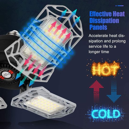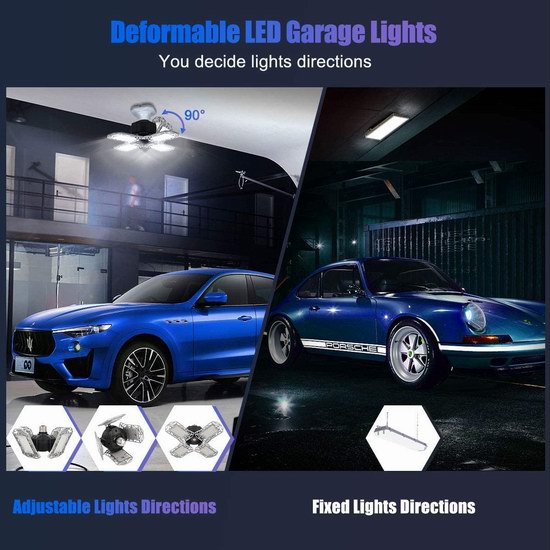 此款车库灯配备LED节能芯片,无暗区、重影或眩光,亮度高达12000流明,每个灯板照明角度可调,兼容标准E26灯座,无需工具,可直接装在普通灯座上使用,非常适合室内照明和车库照明。