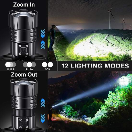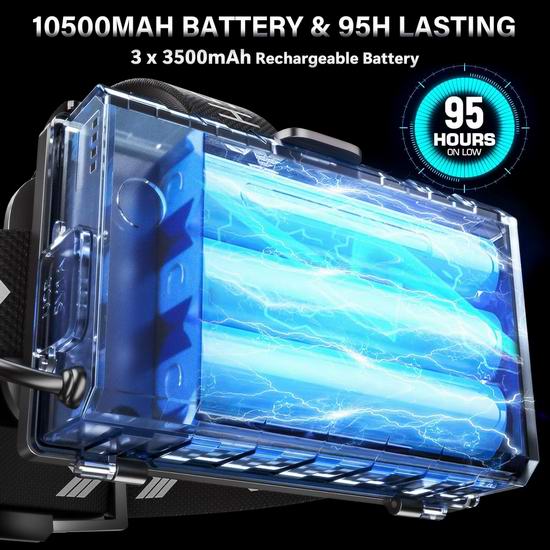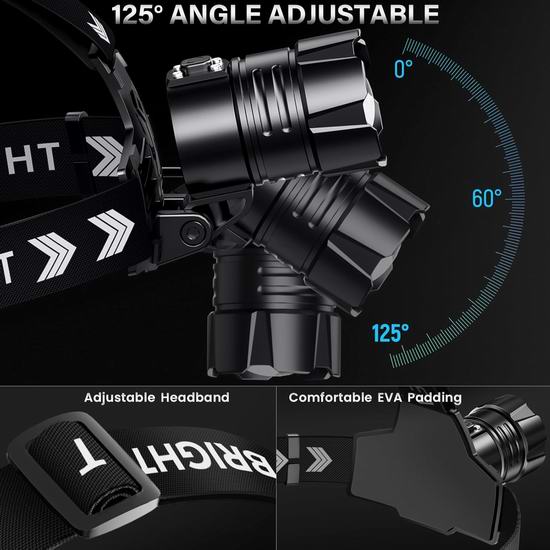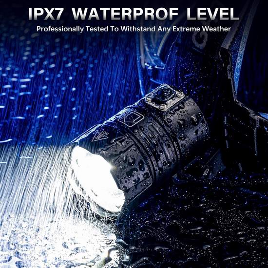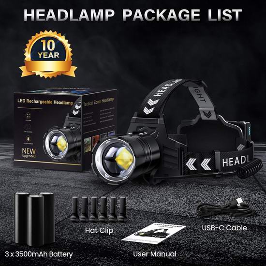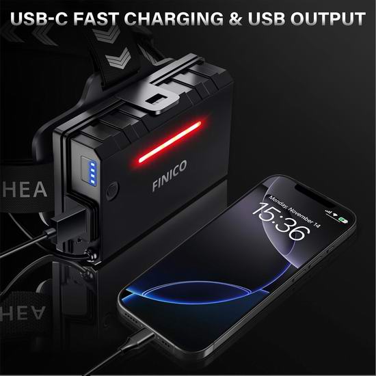 FINICO可充电头灯内置最新升级的 LED 芯片,亮度是普通 LED 技术的 35 倍,高达 990000 流明,照射距离可达 5500 英尺。LED 头灯在低亮度模式下可连续工作长达 95 小时,使用寿命可达 450000 小时。具有12照明模式,可切换泛光和聚光模式。两种模式下均有高/中/低/闪烁/SOS 五种照明模式,在任何照明模式下,长按按钮 1-2 秒即可关闭头灯。内置3 节 3500mAh 可充电电池,配备 USB 输出端口,可在户外紧急情况下用作移动电源,为您的手机或其他设备充电。头灯轻巧便携,即使长时间佩戴也倍感舒适。头灯可旋转 125° 并牢固固定,防止晃动和滑动。IPX7级防水,灯体采用军用级铝合金,并配有防水橡胶圈。头灯带有夜间警示尾灯。