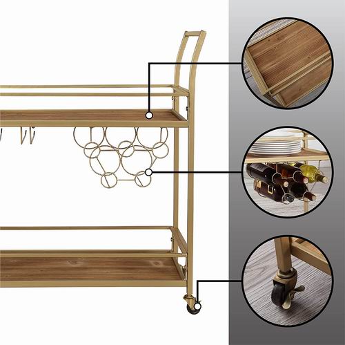 采用金属框架+人造木架子,两层设计,第一层及第二层顶部是开放式的,放置饮料和小吃,第二层底部可容纳多达 6 个酒杯和 5 个用于存放酒瓶的隔间;尺寸大小:高度为 32 英寸,宽度为 15 英寸,深度为 12. 25 英寸,可用作咖啡车、餐厅储藏室,甚至可以用作茶几。