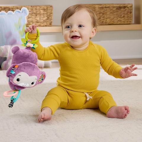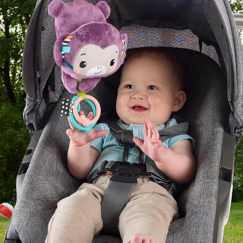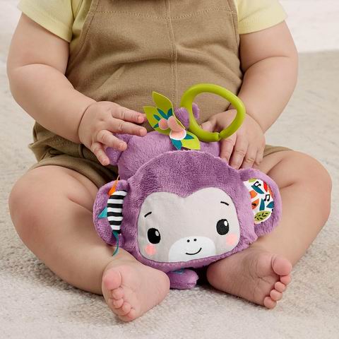 一款可随身携带的婴儿推车玩具,具备多种感官细节,可播放来自费雪豪华踢踏钢琴健身架的紫色小猴子旋律(健身架需另购)。宝宝只需拉动并松开响片,即可听到这段深受喜爱的旋律和趣味音效。玩具包含优质面料、缎带、高对比色、响片、沙沙耳朵与铃铛,为新生儿提供多重感官刺激。通过便捷连接环,可轻松挂在推车、健身架或尿布包上,助力发展精细动作技能并促进感官发育,是宝宝随行玩耍的理想选择。
