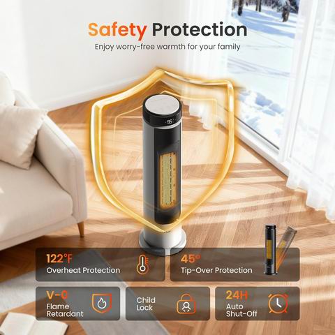 采用1500W PTC陶瓷加热技术,能高效温暖约20平方米的大房间。它提供5种灵活模式(3档加热、ECO节能及单独风扇)和70°广角摆动功能,可通过遥控器或12小时定时器便捷操控。运行噪音最低仅23分贝,且配备多重安全保护(倾倒断电、过热保护、儿童锁等),并带有提手,适合在卧室、客厅或办公室移动使用。