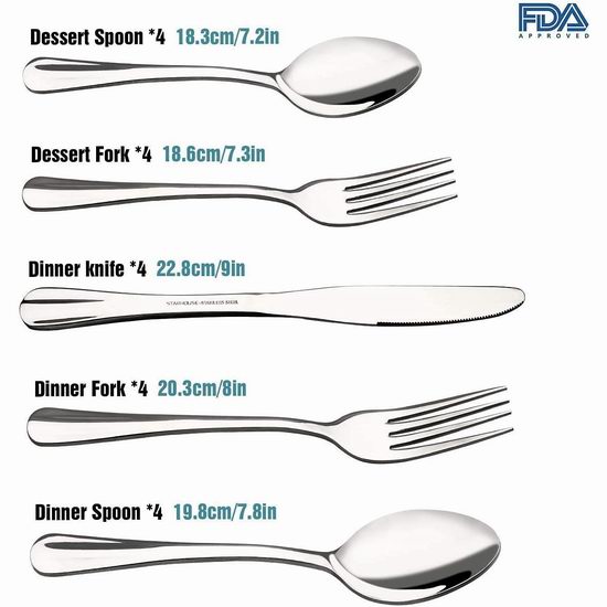 采用优质不锈钢制成,防锈,耐腐蚀,无铅、无镉、不含邻苯二甲酸盐、不含BPA,易于清洁,高度抛光处理,简约风格,20件套包含4个甜点叉、4个甜点勺、4个餐叉、4个餐勺和4个餐刀,洗碗机安全。