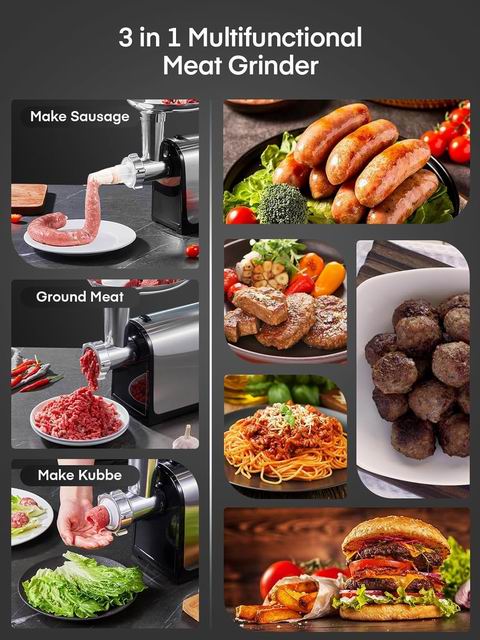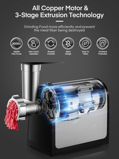 采用300W电机(最大锁定功率2000W),可快速处理牛/鸡/猪/鹿/鱼等多种肉类,轻松制作肉馅。套装含3个绞肉盘(2/5/7mm)、2个不锈钢刀片,以及不锈钢灌肠器与灌肠管,可绞肉+灌肠一机多用。食品级材料与不锈钢结构更安全卫生,带锁定旋钮、过载/过热保护,异常时自动断电;通过ETL认证。操作简单,配“R”反转按钮便于清除堵塞。配件可拆卸便于清洁,但不建议放入洗碗机,清洗后需擦干。