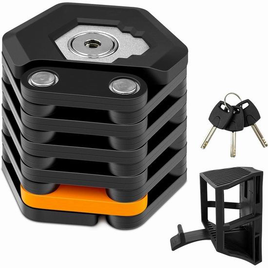 这款折叠自行车锁采用优质合金钢制成,具有抗液压切割和防锯、防钻、防锈等特性,配备C级锁芯,更加安全、坚固且防水。配有3把钥匙,独特的钥匙孔设计防止混淆。采用特殊铆钉设计,折叠轻松灵活,折叠尺寸为 6.6 x 5.5 x 7.5 厘米,展开尺寸为78厘米。适用于大多数自行车,可将自行车锁在树木、门、栅栏、栏杆、粗柱子等处。重量仅575克,采用特殊铆钉设计,折叠轻松便捷。