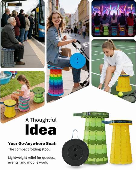 这款折叠凳采用高密度PP塑料制成,11层互锁式鱼鳞状结构,并配有加固塑料板,使凳子更坚固,更容易打开和关闭,随心调节凳子高度,承重高达400磅,而重量仅为1.98磅,还贴心配有可调节肩带,方便携带或挂在肩上。无论去哪里,都能随时随地坐下。