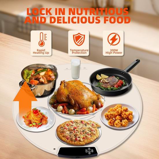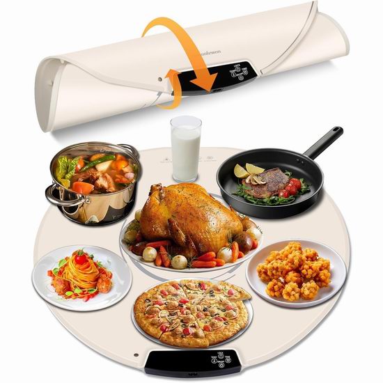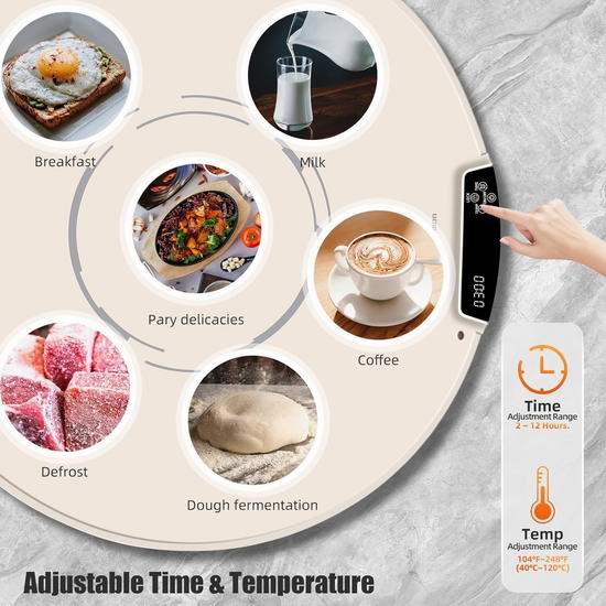 Spoonlemon 电热保温垫采用先进的“扩散式”热传递设计,可在短短30秒内均匀快速加热,提供可调节的时间和温度设置,可将食物保温长达12小时,温度范围为 40℃ 至 120℃。触控按钮搭配清晰的指示,让您轻松操控食物保温垫。内置儿童锁,可防止儿童误操作。底部采用“掀起式”设计,便于散热,适用于不同材质和纹理的桌面。采用优质硅胶纳米材料制成,防水、防油、防污,清洁起来极其方便。具备“自动待机”功能,有助于节能,既环保又省钱。25.6英寸直径的加热面提供更大的加热区域,可同时加热多种菜肴,保持食物温暖美味。