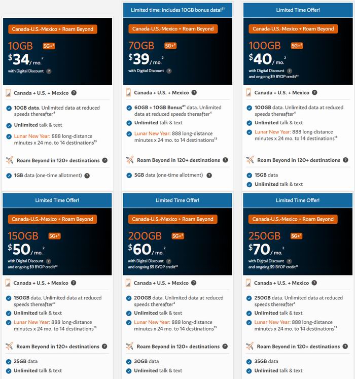 美加墨漫游,250GB数据+888分钟国际长途+一次性送35GB全球漫游数据,月费70加元;点击进入订购页面(需点击本站直达链接激活折扣)。